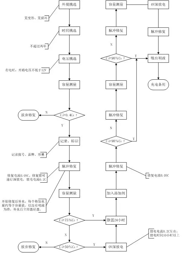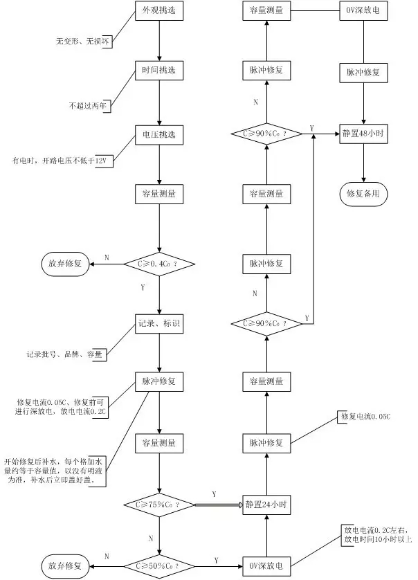 對于密封蓄電池一個基本的修復流程包括初步挑選、信息記錄、放電測量、補充液體,脈沖修復、測量判斷幾部分,使用脈沖法修復電池的修復流程見圖2;